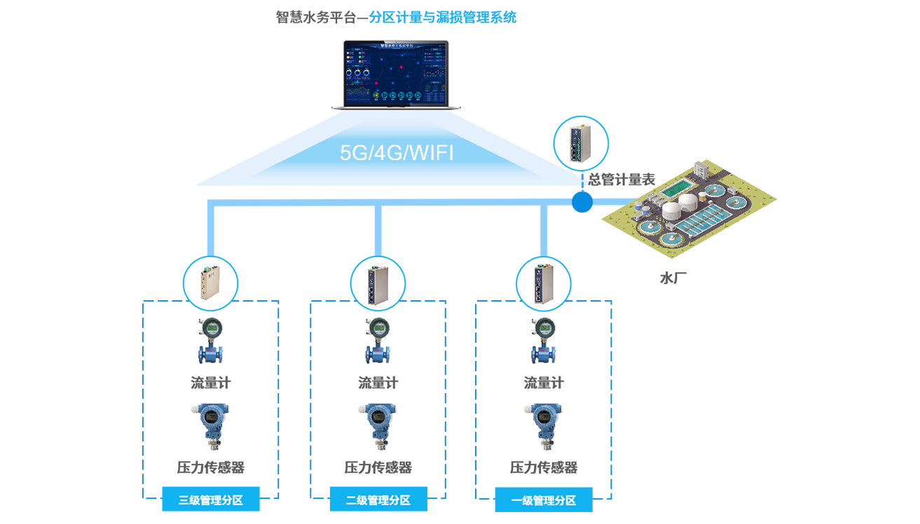將供水管網劃分為多個 DMA 分區,在每個分區的進出口安裝流量傳感器和壓力傳感器,通過物通博聯的工業智能網關將采集到的流量和壓力數據實時傳輸至 DMA 分區計量漏損監測平臺。平臺對數據進行實時分析和處理,通過建立數學模型和算法對漏損情況進行分析和判斷,精準定位漏損點。同時,平臺具備分區計量管理功能,可對各分區的用水情況進行統計和分析,為維修決策提供支持。