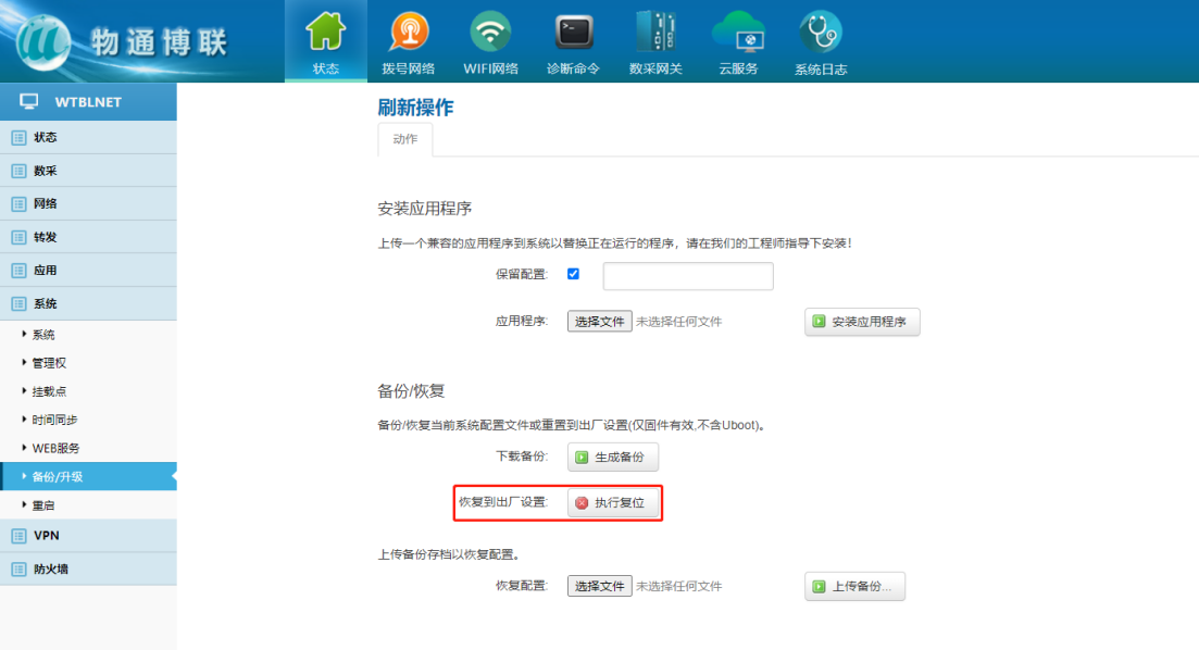 下載中心 視頻中心 常見問題 售后服務 工業網關 設備快線 數據云平臺 聯網設備 問答百科 工業智能網關如何進行軟硬件復位? 時間:2022-10-26 09:13:38 點擊:6877 關鍵詞:工業智能網關,網關復位,網關重啟 問題:工業智能網關如何進行軟硬件復位? 回答: (1)硬件復位 首先斷電后再通電重啟設備網關,當網關指示燈STATUS和WARN交替閃爍后,立即長按RESET鍵,直到ERROR燈慢閃后松開(或3秒后松開),再次長按RESET鍵,直到ERROR燈快閃后松開按鈕(或3秒后松開),網關開始復位 (2)軟件復位 系統——備份/升級——恢復到出廠設置 上一篇:工業智能網關如何設置靜態固定IP? 下一篇: 工業智能網關和DTU有什么區別嗎?