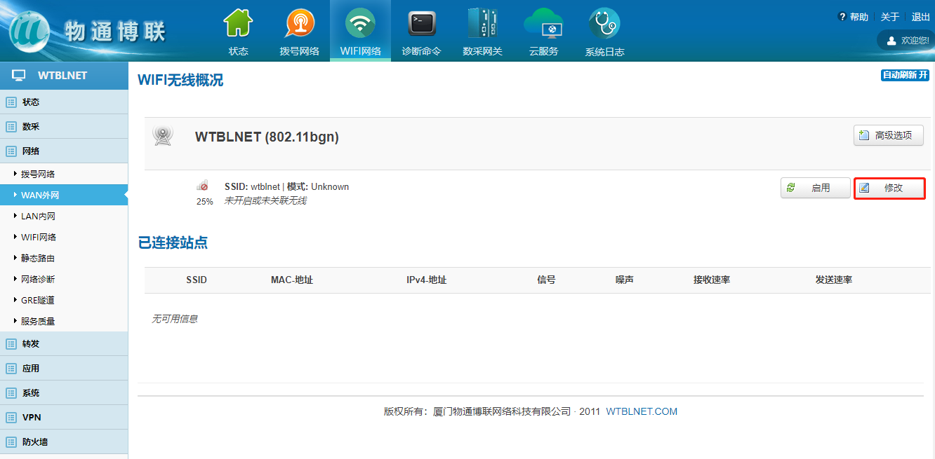 下載中心 視頻中心 常見問題 售后服務 工業網關 設備快線 數據云平臺 聯網設備 問答百科 工業智能網關如何連接wifi熱點? 時間:2022-10-26 09:15:30 點擊:6551 關鍵詞:工業智能網關,wifi 問題:工業智能網關如何連接wifi熱點? 回答: (1)電腦通過網線接入到網關LAN口,瀏覽器輸入192.168.2.1默認地址 (2)登陸網關配置界面選擇WiFi網絡 (3)點擊WiFi界面修改—進入WiFi配置界面 (4)啟用WiFi—填寫ESSID(WiFi名稱)—模式選擇客戶端Client (5)點擊無線安全—輸入WiFi密碼 注意:WiFi獲取到的IP網段與網關LAN口的IP網段不能重復! 上一篇:工業智能網關如何更新程序和固件? 下一篇: 工業智能網關如何使用流量卡上網?