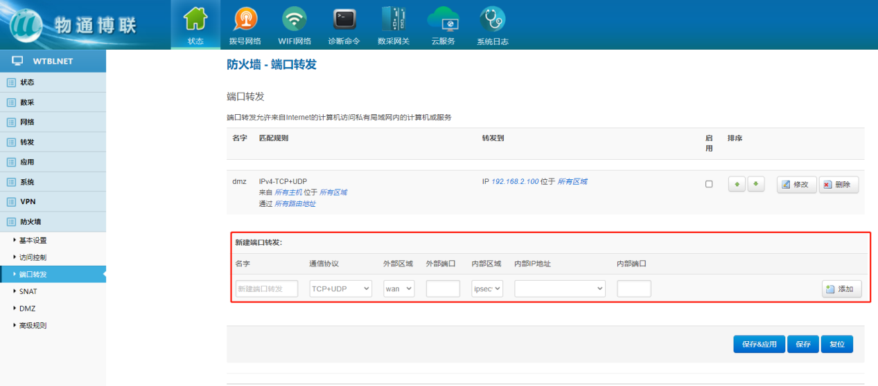 下載中心 視頻中心 常見問題 售后服務 工業網關 設備快線 數據云平臺 聯網設備 問答百科 工業網關如何配置端口映射? 時間:2022-10-26 09:39:53 點擊:6304 關鍵詞:工業網關,網關配置,端口轉發 問題:工業網關如何配置端口映射? 回答: 網關配置界面—防火墻—端口轉發 端口轉發允許來自Internet的計算機訪問私有局域網內的計算機或服務 使用場景:端口轉發是將發往外網的一個端口的通信完全轉發給內網一個地址的指定端口 上一篇:如何通過物通博聯工業網關實現網口設備遠程上下載? 下一篇: 工業智能網關支持的電壓范圍?