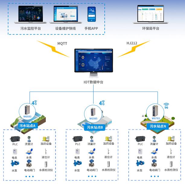 基于日常巡檢與遠(yuǎn)程維護(hù)的需求,物通博聯(lián)提供基于工業(yè)智能網(wǎng)關(guān)的解決方案。通過(guò)將污水處理PLC、DLT智能電表、智能攝像頭等設(shè)備接入到網(wǎng)關(guān),網(wǎng)關(guān)能夠?qū)崟r(shí)采集污水處理工藝參數(shù)、能耗以及實(shí)時(shí)視頻等數(shù)據(jù),并通過(guò)4G網(wǎng)絡(luò)和MQTT協(xié)議對(duì)接到集團(tuán)運(yùn)維管理平臺(tái)中,從而實(shí)現(xiàn)遠(yuǎn)程監(jiān)控、遠(yuǎn)程控制、遠(yuǎn)程抓拍、遠(yuǎn)程維護(hù)等功能,從而實(shí)現(xiàn)智慧運(yùn)維管理,促進(jìn)降本增效目標(biāo)的實(shí)現(xiàn)。