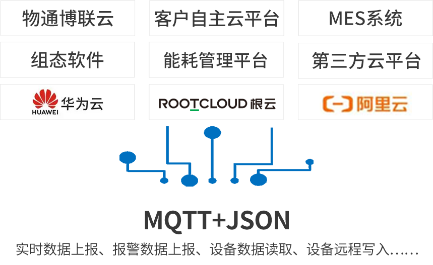 北向支持MQTT協(xié)議接入物通博聯(lián)云平臺(tái),客戶自主開(kāi)發(fā)的云平臺(tái),第三方云平臺(tái)(根云、美云、華為、阿里、百度、微軟等IOT云平臺(tái)),組態(tài)軟件、MES系統(tǒng)、ERP系統(tǒng)等工業(yè)軟件