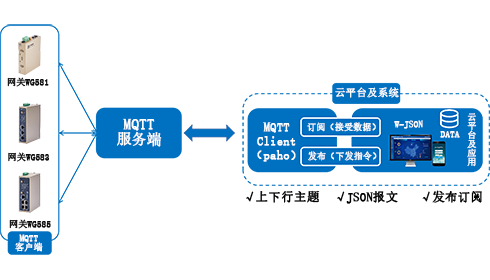網(wǎng)關(guān)內(nèi)嵌MQTT客戶端,它建立與部署在服務(wù)器上的MQTT Broker的雙向通信鏈路;同時(shí)客戶自行開(kāi)發(fā)的云平臺(tái)(或本地軟件)也是通過(guò)MQTT客戶端來(lái)和MQTT Broker來(lái)實(shí)現(xiàn)訂閱和發(fā)布數(shù)據(jù)的雙向通信。