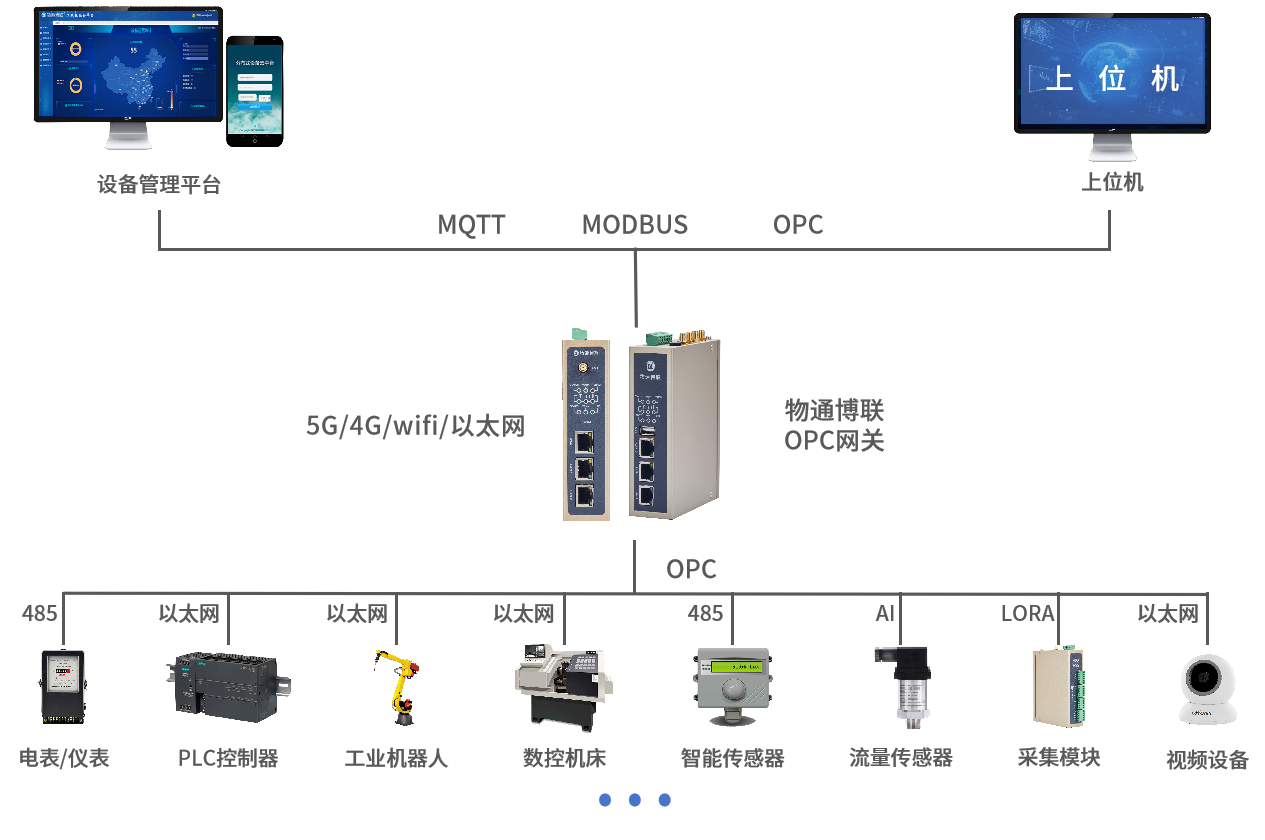 物通博聯OPC網關具有設備聯網、數據采集、協議解析、邊緣計算、云端接入等功能,支持OPC UA協議解析數據采集,能夠連接到PLC、儀器儀表、傳感器、數控機床、DCS、SCADA等,實時采集數據并通過Modbus/MQTT協議傳輸到云平臺或本地上位機,支持采集設備數據通過OPC UA協議轉發給組態軟件、上位機軟件、云平臺,實現設備遠程監控、遠程管理。
