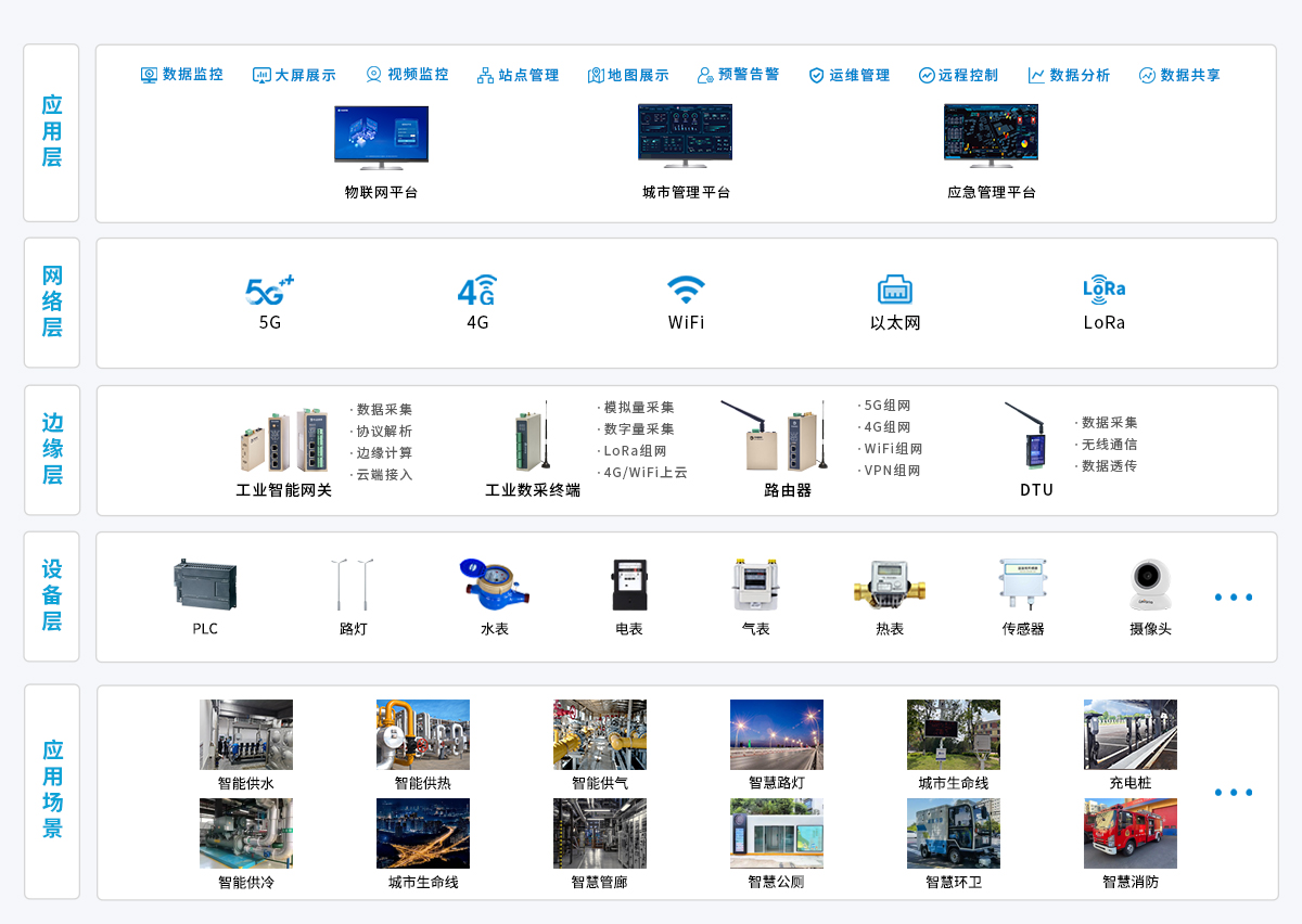 物通博聯構建 “感知 - 邊緣 - 中臺 - 應用” 全棧式智慧城市技術架構:感知層以多品類網關、終端為核心,接入交通、能源、水務、安防等領域設備,采集多源異構數據;邊緣層通過本地化計算預處理數據,依托多網絡制式構建安全傳輸通道,向云端高效傳數據。中臺層以 IOT 數據中臺為樞紐,完成數據治理與資產化管理,破解數據孤島;應用層落地設備監控、能耗分析、民生服務等場景,形成數據驅動的智慧城市運營模式,提升管理效率與民生服務水平。