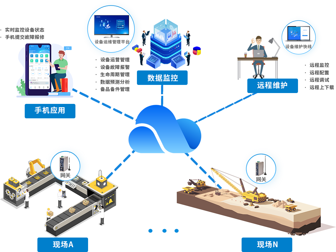 物通博聯針對設備制造商的裝備數字化需求,構建了“終端數據采集-多網融合傳輸-云端智能運維-遠程協同服務”的全周期技術解決方案:以工業智能網關為核心,采集裝備運行參數、運行狀態等數據,通過 5G/4G/WiFi/ 以太網等方式將標準化數據實時上傳至設備運維管理平臺。平臺借大數據分析與故障診斷算法,實現數據監控、趨勢預測與異常識別,設備存故障風險時自動觸發預警。依托設備維護快線,可遠程完成程序上下載、參數調試等操作,提升維護效率、降低運維成本,助力設備制造商實現裝備全生命周期數字化管理。