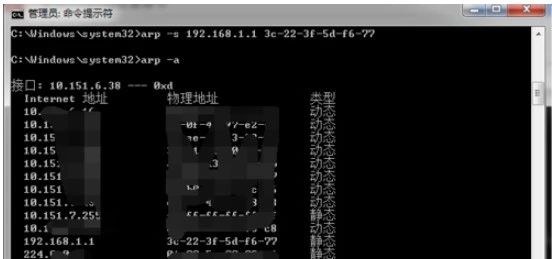 如下圖,先用ARP -s 192.168.1.1 3c-22-3f-5d-f6-77綁定一條記錄,然后用arp -a查詢了ARP記錄添加是否成功。