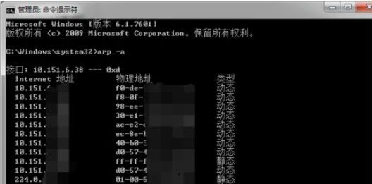 在命令提示符中輸入“arp -a”并回車;自動在緩存中,讀取IP地址和mac地址的對應關系表;