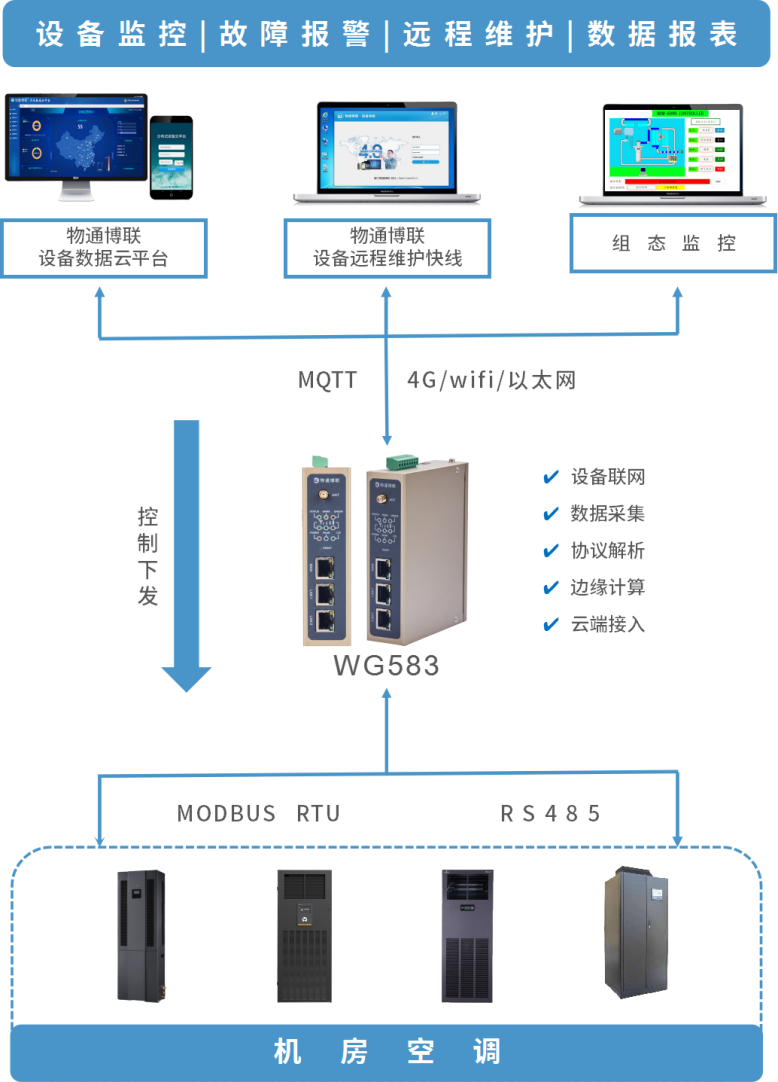機房現場的恒溫加濕精密空調設備通過RS485串口連接到工業智能網關WG583,網關實時采集設備數據并通過4G/WIFI/以太網等方式上傳到IOT云平臺。通過IOT云平臺,用戶可以隨時查看設備運行狀態、技術參數、組態監控畫面并遠程控制設備啟停。當設備異?;蛘吖收蠒r,系統會自動報警,并將故障報警信息自動通過手機、郵件、微信等方式通知管理人員,管理人員能夠及時對設備進行遠程維護或者現場維護,實現機房空調的智能管理控制,從而保證現場環境溫濕度的恒定安全。