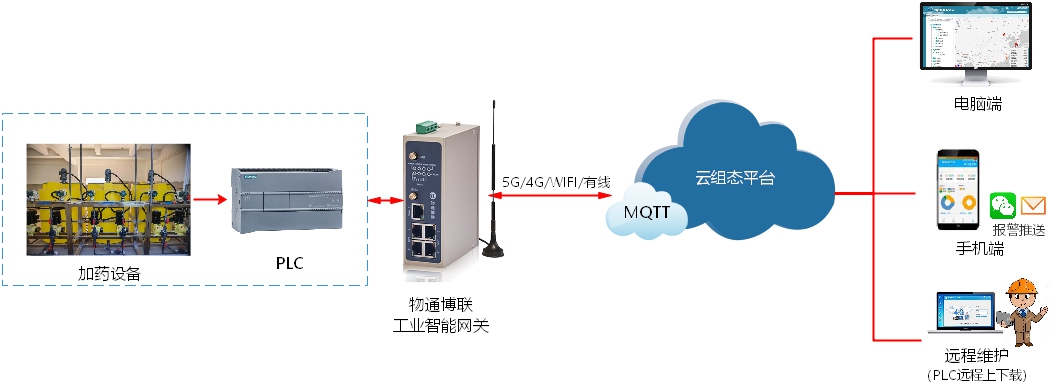 物通博聯(lián)提供污水處理加藥設(shè)備云組態(tài)遠(yuǎn)程監(jiān)控系統(tǒng)方案。通過(guò)將物通博聯(lián)工業(yè)智能網(wǎng)關(guān)接入加藥設(shè)備控制器 PLC,實(shí)時(shí)采集數(shù)據(jù)并通過(guò)5G/4G/WIFI/以太網(wǎng)等網(wǎng)絡(luò)對(duì)接到物通博聯(lián)云組態(tài)平臺(tái)中,進(jìn)行編輯繪制搭建組態(tài)大屏,從而直觀展示污水處理加藥設(shè)備的運(yùn)行狀態(tài)與工藝參數(shù),并在出現(xiàn)異常時(shí)自動(dòng)告警,從而靈活運(yùn)用遠(yuǎn)程控制、遠(yuǎn)程維護(hù)、數(shù)據(jù)分析等手段,提高工作效率并減少人工成本,保障污水處理工作安全、高效開展。