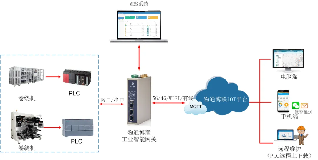 數據可對接到物通博聯IOT平臺、MES系統上,用戶可通過手機、電腦或車間大屏實時查看設備的各項參數和報警信息,方便企業對整個生產車間的設備進行集中管理。